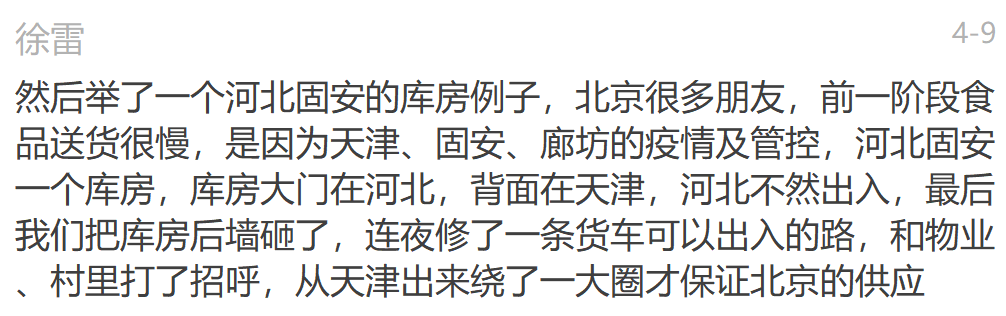 我要说的是,我们的人民警察那是很辛苦的,归根结底还是得恢复正常的物流渠道,不能想着让110变成闪送电话。京东物流的创始人之一罗辉林说:弃用专业的快递物流队伍不用,让公务员、志愿者、武警、军人去干快递,这不是多此一举吗?还搞得全城弹尽粮绝。