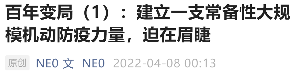 今天他的新文章,认为要建立一支常备大规模防疫机动力量。因为现在的防疫模式是“一方有难,八方支援”,问题是疫情多点开花,就会变成“八方有难,八方支援”,消耗太大。要学习以战养战。