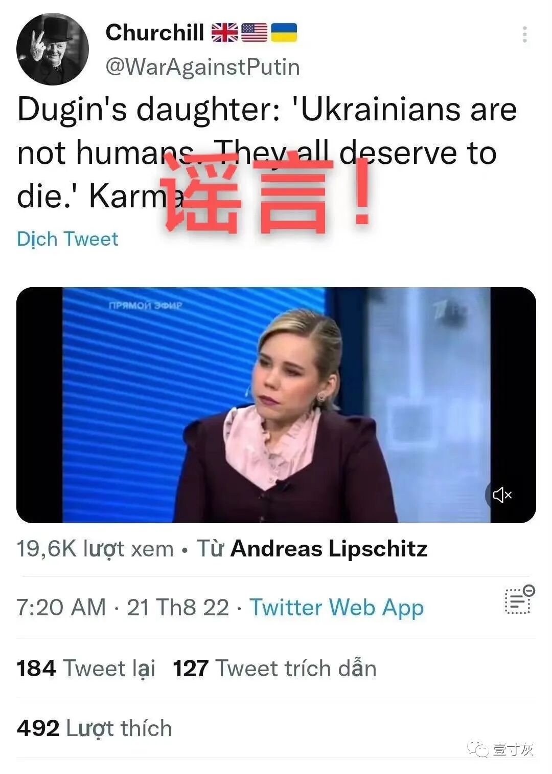 ,说她曾说过“乌克兰人都不是人,乌克兰人都该死。”造谣营销号放出一个杜金娜在电视节目中的发言,说这就是证据。一大堆看不懂俄语的人就跟在后面谩骂传谣,