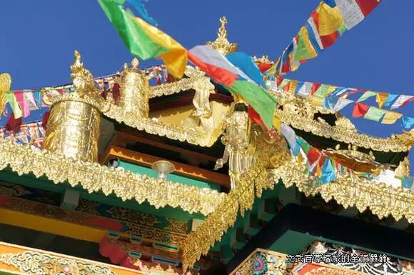 3、第三层供奉寂静四十二尊黄铜金像,并以格萨尔王及其眷属大将等护法围绕,殿门旁为四大守护明王。殿外的妙欲台阶上共有十六位供养天女。