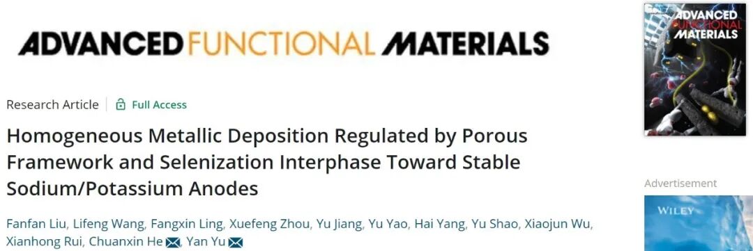 Homogeneous Metallic Deposition Regulated by Porous Framework and Selenization Interphase Toward Stable Sodium/Potassium Anodes. Advanced Functional Materials 2022. DOI: 10.1002/adfm.202210166