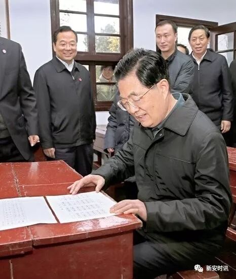 胡锦涛在自己曾经坐过的座位上,仔细看着过去的座次表,并高兴地回忆当年上学时的情景。