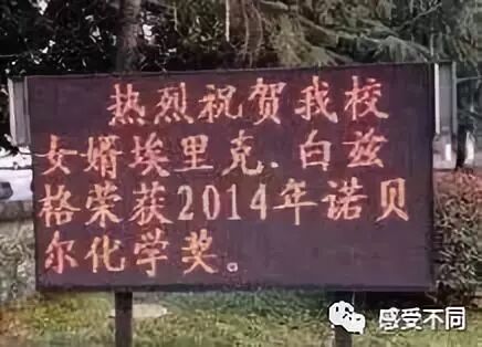 2014年10月,诺贝尔化学奖得主揭晓,美国科学家埃里克•白兹格获此殊荣,奖项是为了表彰他们在超分辨率荧光显微技术领域取得的成就。而他的夫人吉娜,就是蚌埠人,毕业于蚌埠市第一中学。近日,有网友拍到安徽蚌埠一中挂出“热烈祝贺我校女婿埃里克•白兹格荣获2014年诺贝尔化学奖”的标语。女婿评测:暂未见报道