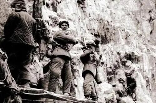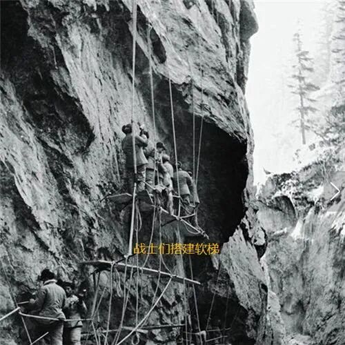 为了缩短施工时间,他们从山顶放下了绳索,然后一段一段做成了软梯。