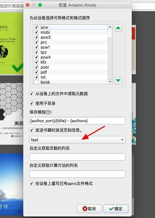 在 Calibre 的工具栏中找到“设备”图标按钮,点击旁边的倒三角,在弹出的菜单中点击“配置该设备”,可以弹出一个名为“配置 Amazon Kindle”的对话框。在此对话框中你可以找到“发送书籍时发送页码信息”这个选项(默认勾选),此选项表示使用 Calibre 把电子书发送到 Kindle 设备时附加页码元数据。