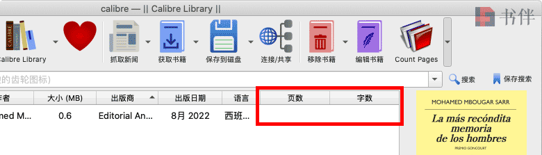 Calibre 和 Count Pages 插件的相关配置完成后,在 Calibre 书库列表中选择你想要统计的电子书,即可鼠标左键单击 Calibre 上方的 Count Pages 图标开始计算电子书的页数和字数。