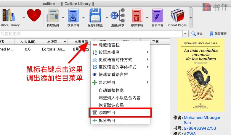 由于 Count Papges 插件需要将统计好的页数和字数存放到电子书所在行的两个自定义栏位中,因此在使用该插件之前,必须先为 Calibre 的书库列表新增如下图所示的两列自定义栏目。