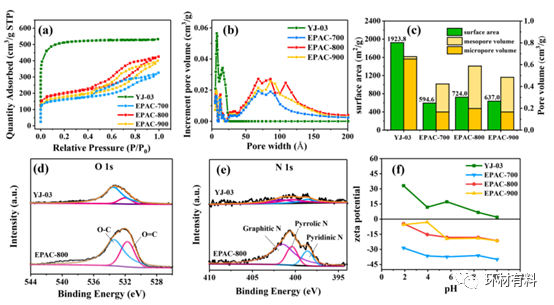 图1 (a) YJ-03和EPACs的N2吸附-解吸等温线。(b) DFT模型计算的孔径分布。(c)制备的活性炭的比表面积和孔体积比较。(d) YJ-03和EPAC-800的O1s和(e) N1s XPS谱。(f) 制备的AC在不同pH下的Zeta电位