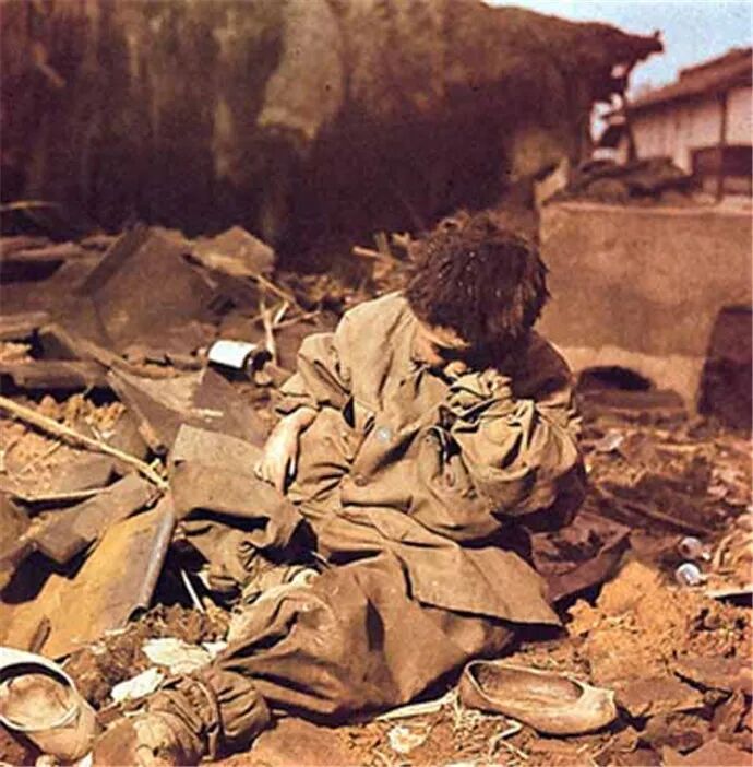 (废墟当中,快要饿死的韩国孤儿)