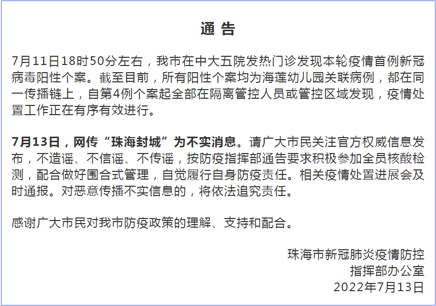 据珠海发布消息,7月13日23时许,珠海市疫情防控指挥办发布通告:网传“珠海封城”为不实消息,全文如下:7月11日18时50分左右,珠海市在中大五院发热门诊发现本轮疫情首例新冠病毒阳性个案。截至目前,所有阳性个案均为海莲幼儿园关联病例,都在同一传播链上,自第4例个案起全部在隔离管控人员或管控区域发现,疫情处置工作正在有序有效进行。7月13日,网传“珠海封城”为不实消息。请广大市民关注官方权威信息发布,不造谣、不信谣、不传谣,按防疫指挥部通告要求积极参加全员核酸检测,配合做好围合式管理,自觉履行自身防疫责任。相关疫情处置进展会及时通报。对恶意传播不实信息的,将依法追究责任。![]()