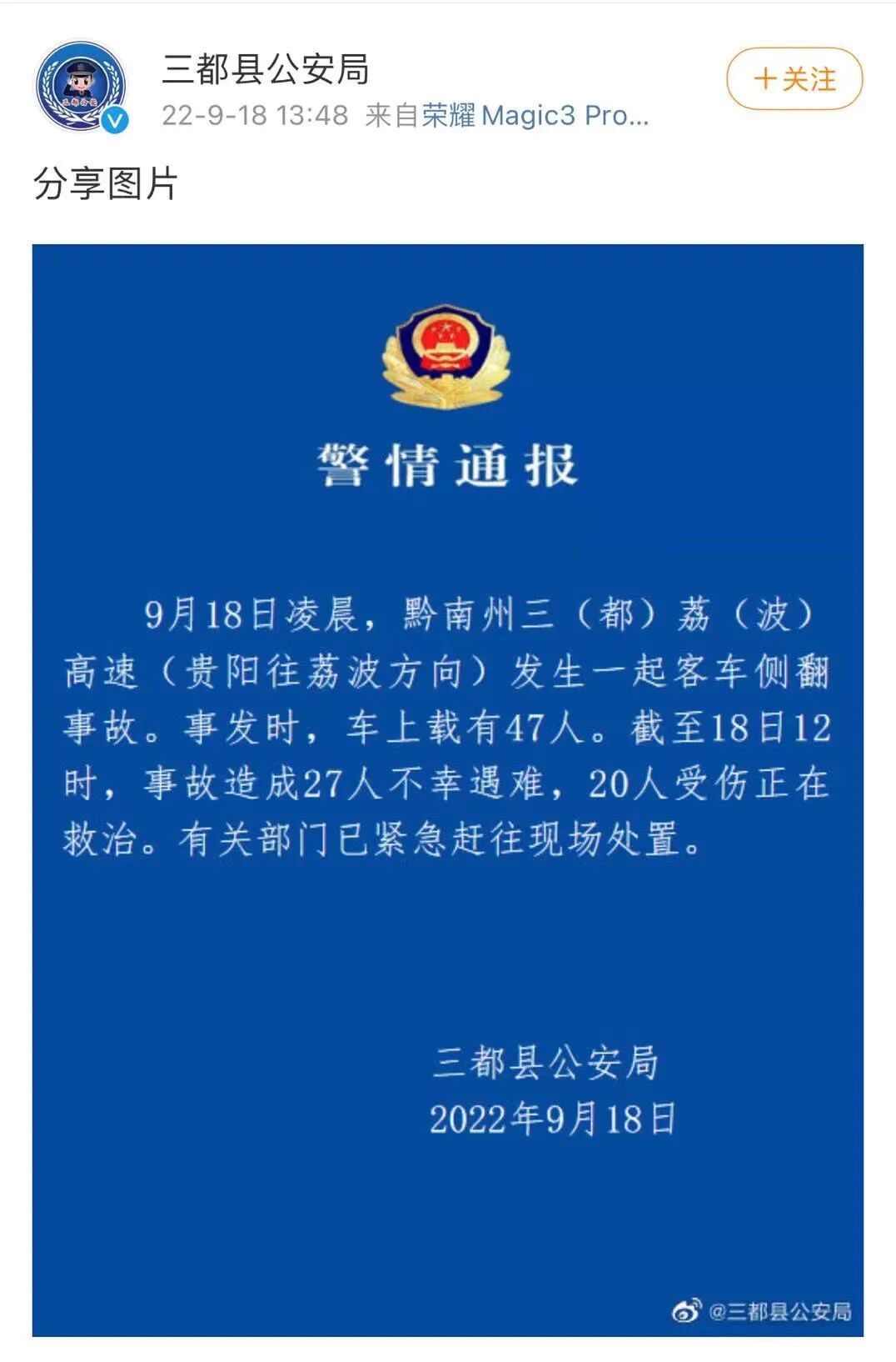 车上载有47名人员,其中驾驶员1名,随车工作人员1名,其余45人均为云岩区涉疫居民。9月18日2:40许,车辆行驶至黔南州三都至荔波高速32公里处发生侧翻,坠入路旁深沟。截至9月18日21时,事故共造成27人不幸遇难,20名伤者被就近送往医院救治。