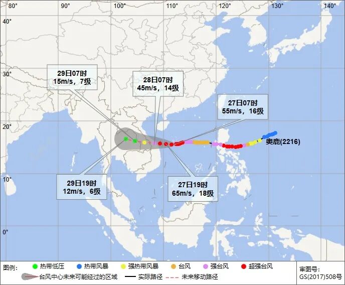 预计“奥鹿”将以每小时25公里左右的速度继续向偏西方向移动,27日经过西沙群岛南部海域,强度维持或略有加强,将于28日早晨到中午在越南东部沿海登陆,登陆后强度快速减弱。