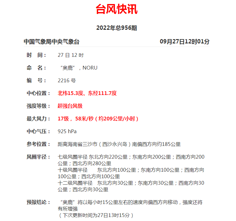 据悉,今年第16号台风“奥鹿”已于27日凌晨再次加强为超强台风级,7时中心在距离永兴岛偏南方向约140公里的南海中东部海面上,中心附近最大风力16级(55米/秒),七级风圈半径200~280公里,十级风圈半径100公里,十二级风圈半径50公里。