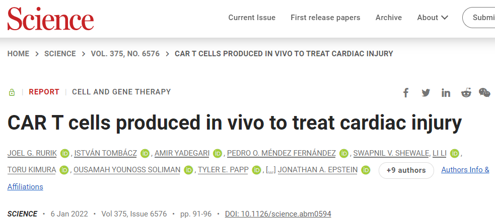 在最新一期《科学》杂志的封面文章中,宾夕法尼亚大学佩雷尔曼医学院的研究团队创新性地利用一次mRNA注射,在患心衰的小鼠体内实现CAR-T治疗,成功修复了小鼠心脏的功能。
