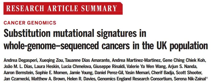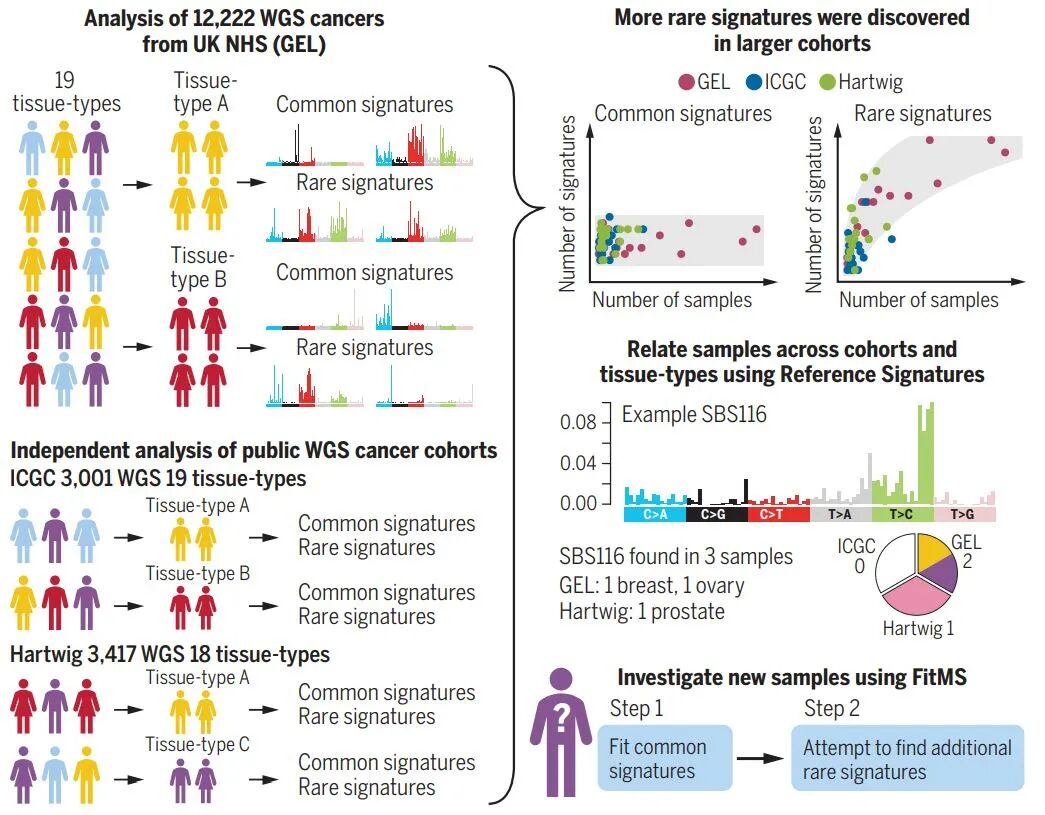 ▲常见突变特征和罕见突变特征的发现和应用(图片来源:参考资料[1]) 根据这些分析结果,研究人员还确认了每个器官都包含数量有限的常见突变特征(通常是5~10个单碱基置换)。与此同时,每种类型的肿瘤可能还具有一些罕见突变特征。 基于这些数据,研究人员创建了一种名为FitMS的新算法,其他研究者或是临床医生每次获得新的肿瘤样本后,可以用来识别已知的常见突变特征,以及找出额外的罕见突变特征。展望未来,研究人员希望这种方法最终将有助于每一名癌症患者在临床治疗中获得更好的诊断和治疗方案,比如是否会对免疫疗法有反应、受益于哪种靶向治疗等。 参考资料:[1] Andrea Degasperi et al., (2022) Substitution mutational signatures in whole-genome–sequenced cancers in the UK population. Science. Doi: https://doi.org/10.1126/science.abl9283[2] Largest study of whole genome sequencing data reveals ‘treasure trove’ of clues about causes of cancer. Retrieved Apr. 21, 2022 from https://www.eurekalert.org/news-releases/949983