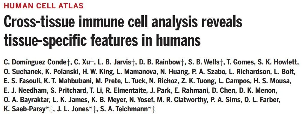 题图来源:参考资料[7];Credit:Aviv Regev and Anna Hupalowska on behalf of the Human Cell Atlas[1] The Tabula Sapiens Consortium, (2022) The Tabula Sapiens: A multiple-organ, single-cell transcriptomic atlas of human. Science Doi: 10.1126/science.abl4896[2] Gökcen Eraslan et al., (2022) Single-nucleus cross-tissue molecular reference maps toward understanding disease gene function. Science. Doi: 10.1126/science.abl4290[3] C. Domínguez Conde et al., (2022) Cross-tissue immune cell analysis reveals tissue-specific features in humans. Science Doi: 10.1126/science.abl5197[4] Chenqu Suo et al., (2022) Doi: [5] Zedao Liu & Zemin Zhang (2022) Mapping cell types across human tissues. Science Doi: 10.1126/science.abq2116[6] Multi-tissue cell atlases lead to leap of understanding of immunity and disease. Retrieved May 13, 2022 from https://www.eurekalert.org/news-releases/951822[7] Presenting the most comprehensive, cross-tissue cell atlases to date: New findings from the Human Cell Atlas consortium. Retrieved May 13, 2022 from https://www.eurekalert.org/news-releases/951983