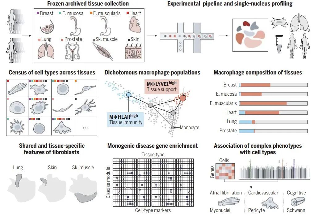 ▲该研究收集分析了8种人体器官组织(包括心脏、皮肤、肺、前列腺、胸腺、骨骼肌、食道粘膜、食管肌层)的细胞类型,将细胞与罕见疾病、常见疾病的风险基因联系起来(图片来源:参考资料[2])