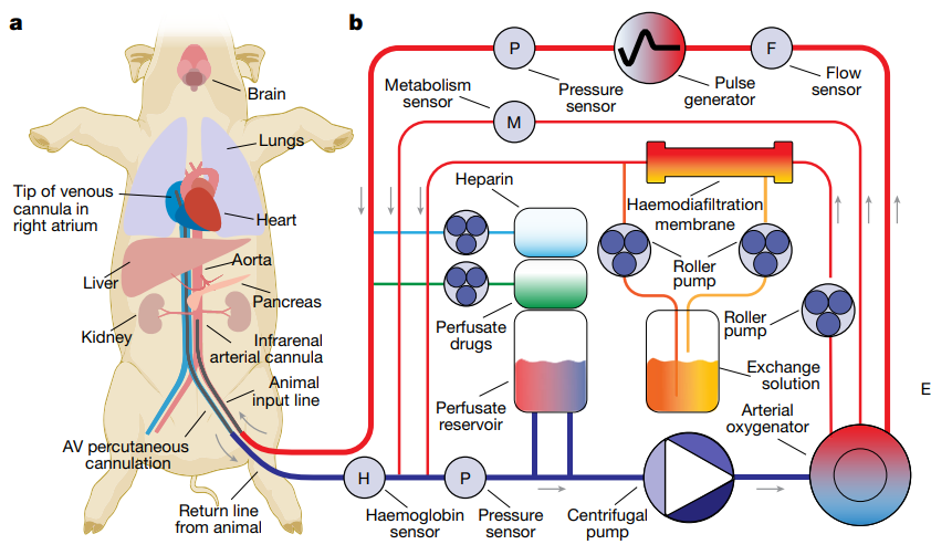 许多科幻题材中都会描绘死而复生的画面,比如弗兰肯斯坦拼接的怪人又或者服下就能复活的仙丹妙药。现实中的逆转死亡当然没有这么戏剧化,但仍然足够令人震惊。我们上次近距离感受“逆转死亡”是在2019年,当时耶鲁大学的神经科学家Nenad Sestan教授团队发布了一个体外灌注系统——BrainEx,它能够通过颈动脉向猪的大脑灌注包含人造血红蛋白和各种分子的保护性液体。尽管大脑来源死亡已经4小时,但在接入BrainEx系统6小时后,大脑的血管微循环已经恢复,并且细胞能对外来药物作出血管扩张等行为,另外大脑皮层的部分细胞功能也成功恢复。时隔3年,Sestan教授和同事在“复活”大脑的基础上,将逆转死亡的部分扩大到了全身。研究团队将BrainEx升级成为了OrganEx,可以更好地为大脑之外的器官组织在死后提供营养和氧气。相关论文已经发表在《自然》杂志上。全新的OrganEx技术包括灌注系统和合成灌注液两部分,前者分为脉冲发生器和离心泵,可以提供生理性压力的波动,而整个灌注系统中将充满脱细胞,以及基于血红蛋白和细胞保护的灌注液,成分已经从BrainEx版本的大脑适用升级成全身兼容。![]()