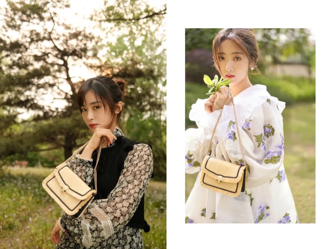 同款还有薰衣草紫色和黑色,像沈月和邢菲这样,穿一条碎花连衣裙背这款包包也还挺好看的。
