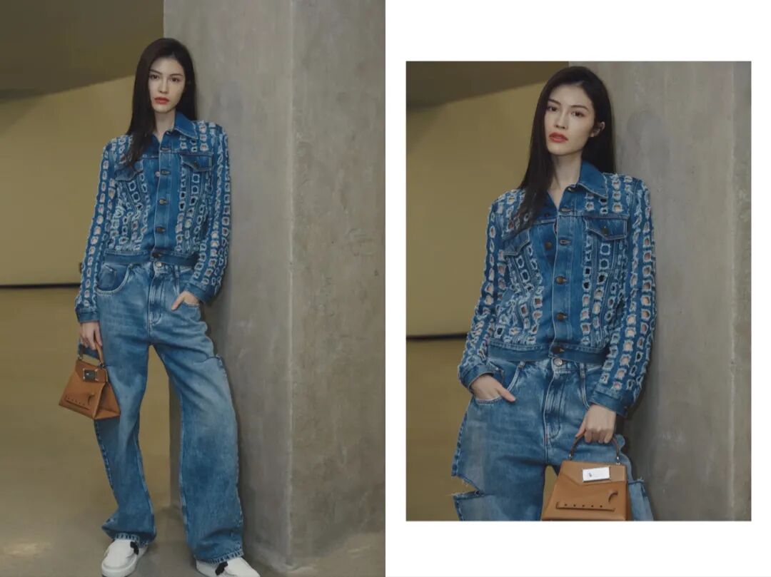 褐色那只真的太像牛皮纸袋了,何穗用它搭配一身牛仔蓝。