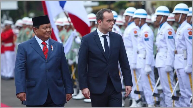 11月25日,国防部长普拉波沃(左二)在雅加达国防部大厦接见法国防长塞巴斯蒂安·勒科尔尼(左三),两人也检阅了仪仗队。
