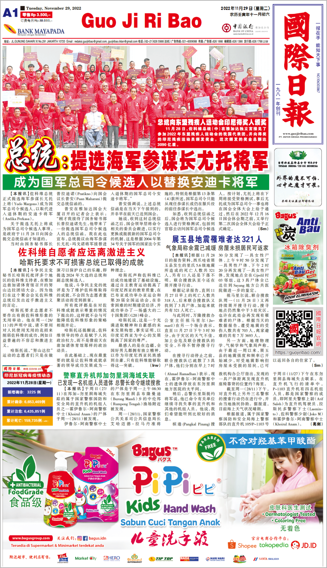 【本报讯】根据11月28日的报告资料,西爪哇省展玉县发生的里氏5.6级地震所造成的死亡人数共321人,另有11人还是下落不明。联合搜救队至今还在展开搜寻行动。