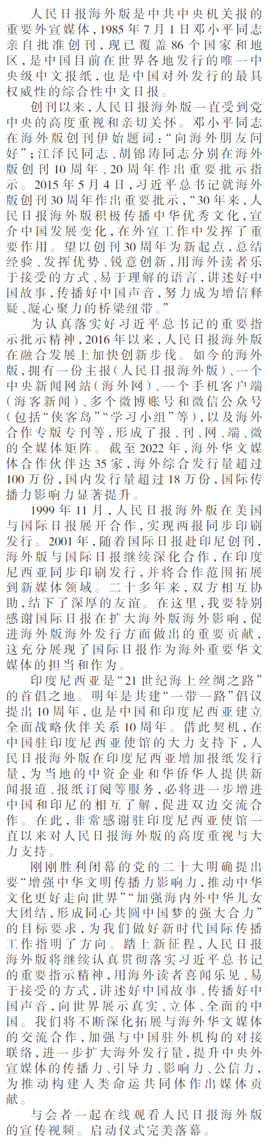 陆慷大使致辞说,很高兴在线出席人民日报海外版在印尼增发启动仪式。我谨代表中国驻印度尼西亚大使馆,向人民日报海外版编辑部和国际日报社表示衷心祝贺,祝人民日报海外版在印尼增发顺利,祝两家报社的合作之路越走越宽广,继续成为新时代媒体合作的榜样。人民日报海外版是中国重要的对外窗口,传递的是最具权威性的“中国声音”。自从2001年开始与国际日报合作在印尼发行,已经度过了20多个春秋,取得丰硕成果。人民日报海外版已经成为在印尼中资机构、华侨华人、留学生了解祖国和祖籍国发展的重要渠道,也是喜爱中国、热心中印尼关系发展的印尼朋友了解中国的重要平台,为促进中国与印尼文化交流发挥了重要积极作用。人民日报海外版在印尼进一步扩大发行规模,凸显了当前中印尼关系的高水平和重要性,也体现了印尼各界对中国进一步加深认识的强烈愿望。国际日报作为在印尼发行量最大的中文报纸,在熊德龙董事长亲自关怀下,始终关心关注中国社会经济和中印尼关系发展情况,积极支持人民日报海外版在印尼的落地发行工作,有力增进了两国人民的相互了解。![]()