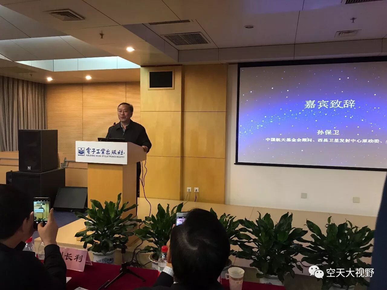 然后由中国航天基金会顾问、西昌卫星发射中心原政委、孙保卫少将致辞。