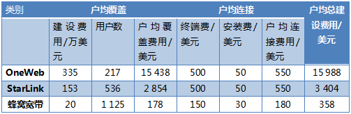 宽带网络每条用户线路的建设费用等于户均覆盖费用与户均连接费用之和。户均覆盖费用等于网络建设费用除以用户数,因此在用户密度越高的地区其值越低。户均连接费用等于用户终端费用与安装费用之和,在用户首次开通服务时产生。根据美国光纤宽带协会的研究,2019年美国光纤到户的户均建设费用在密集城区、一般城区、郊区、农村分别为1218、1863、2737、4206美元(如图2)。StarLink星座单星制造发射成本约153万美元,单星容量约21Gbps。低轨星座天然具有全球覆盖特性,然而地球表面70%以上为海洋和荒野,根据地表人口分布估算其容量利用效率约25.1%,单星有效容量约5.36 Gbps。如果给每个宽带用户分配10Mbps容量,那么StarLink单星可服务约536个用户,户均覆盖费用为2854美元。假设低轨星座用户终端费用加安装费用为550美元,则StarLink卫星宽带户均总费用为3404美元。类似可测算出OneWeb和蜂窝宽带的户均费用(如表1),其中蜂窝宽带采用了华为公司的测算结果。表 1 OneWeb、StarLink与蜂窝宽带户均建设费用测算