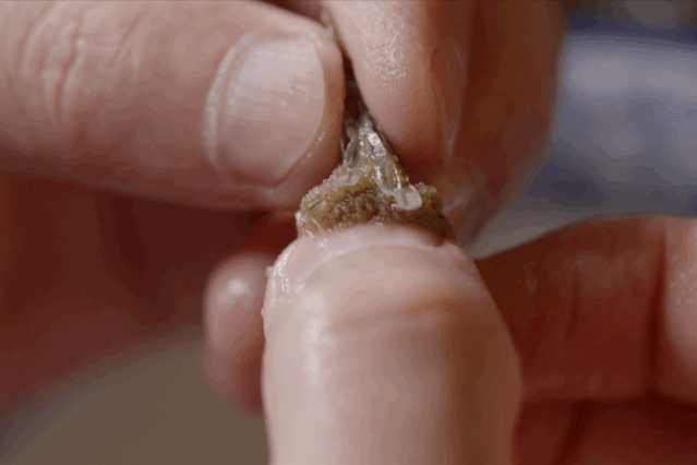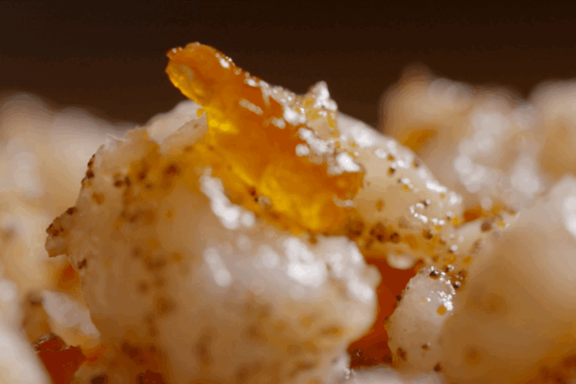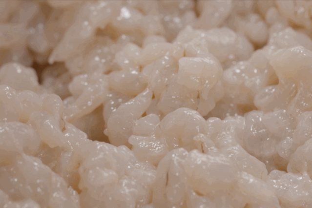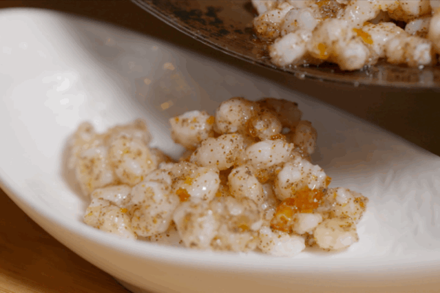 然后加葱、姜等材料,不停翻炒将近一个半小时,直到虾籽表面呈焦黄色。20斤河虾取籽炒制,最终成品也不过170克。
