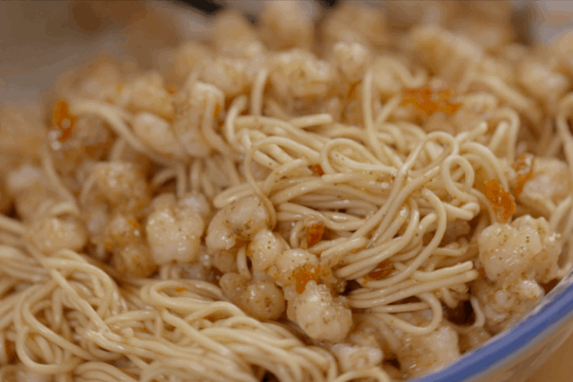 虾脑和虾仁,也是餐桌上的经典食材。精细的三虾浇头,搭配细面和虾籽酱油,巧在心思、贵在人工,可以说是苏式面中的“爱马仕”。