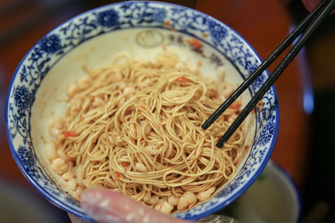 当地人吃三虾面,可汤也可拌。若是“过桥”拌面就得好好搅散,让面条均匀裹上虾籽,才算不辜负这时令鲜物。