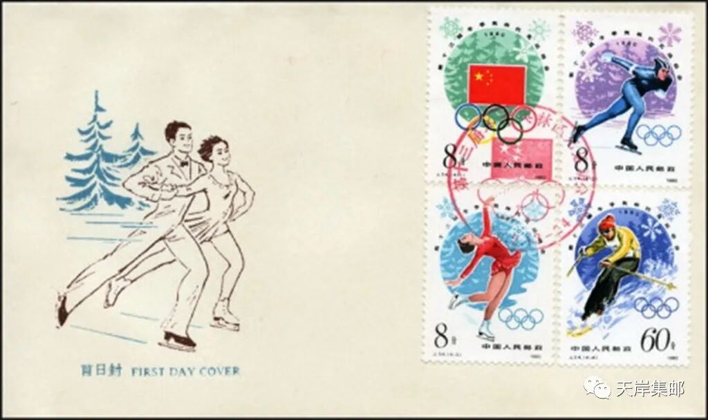 1980年2月13日,为纪念中国首次参加冬季奥运会,邮电部发行了志号为J54的《第十三届冬季奥林匹克运动会》纪念邮票,全套4枚。第1枚主图是中华人民共和国奥林匹克委员会会徽,第2、3、4枚分别描绘了运动员速滑、花样滑冰、滑雪的形象。