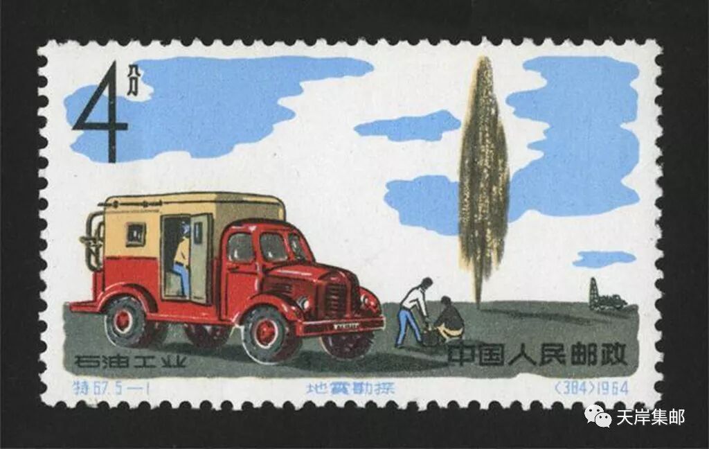 1- 4分 地震勘探:邮票图案为工人利用仪器检测地震勘探的情景。石油堪探是利用仪器检测、记录人工激发地震的反射波、折射波的传播时间、振幅、波形等,从而分析判断地层界面、岩土性质、地质构造的一种地球物理勘探方法。