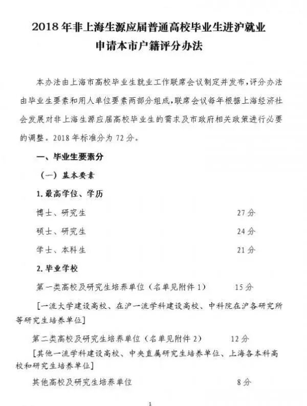 据上海学生就业创业服务网消息,上海市高校毕业生就业工作联席会议日前制定并公布了《2018年非上海生源应届普通高校毕业生进沪就业申请本市户籍评分办法》,提出以北京大学、清华大学为试点,探索建立对本科阶段为国内高水平大学的应届毕业生,符合基本申报条件可直接落户的绿色通道政策。2018年符合该政策的申请,受理时间可延至2018年12月31日。