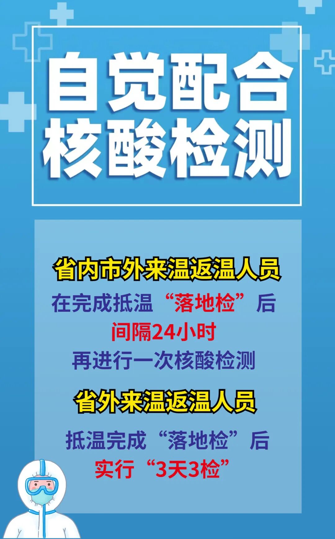 省内市外来温返温人员在完成抵温“落地检”后,间隔24小时再进行一次核酸检测;省外来温返温人员抵温完成“落地检”后实行“3天3检”。