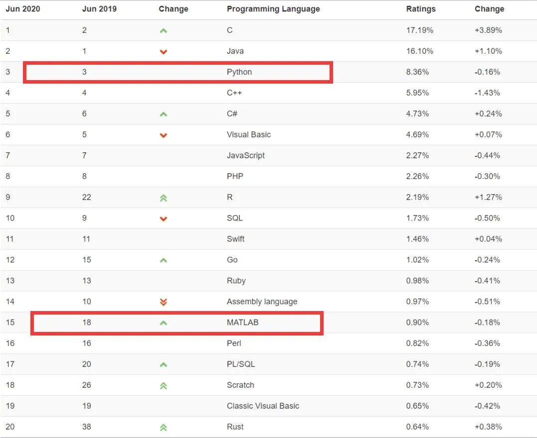 别着急,如下是全球2020.06编程语言排行榜,显示Python位列前三甲,而Matlab在18名开外,这也间接说明Python在全球语言开发中的重要作用!