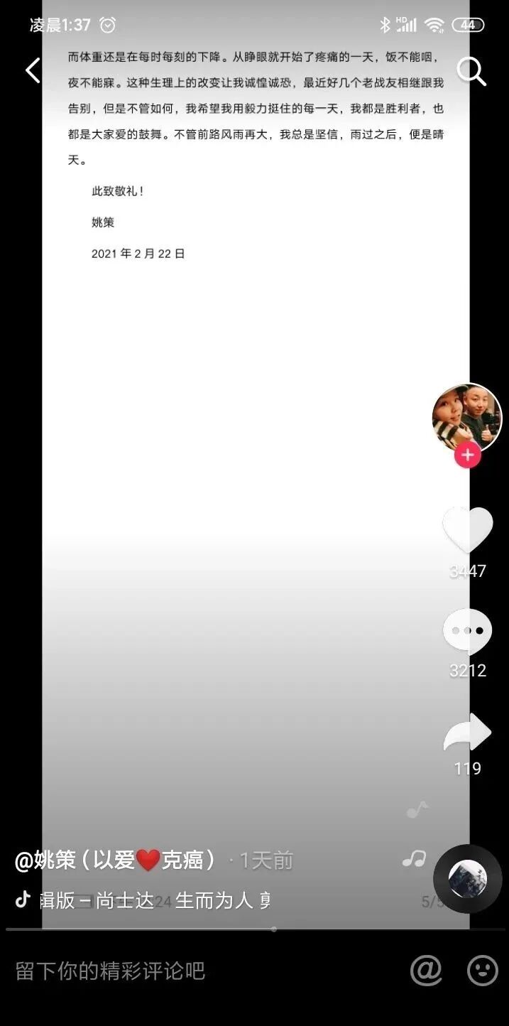 当时姚策曾说,得知患病的那天晚上,是自己人生的“至暗时刻”,他非常彷徨,甚至想过“放弃”。