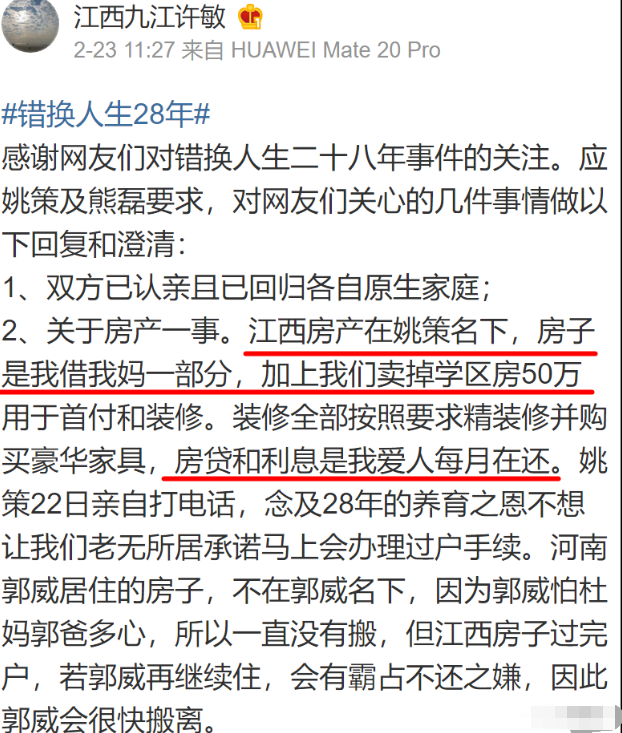 2月24日,错换人生28年案的当事妈妈许敏进驻微博,发长文介绍错换孩子始末。
