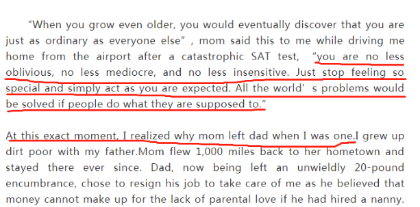 他指责父亲“从不对自己说No”;留意爸爸究竟为什么从不对自己的“贫困”感到伤心。当年采访张家的记者透露,老得曾在朋友家跟朋友讨论,张一得在美国买了一部宝马。朋友还劝他要跟儿子说不能太张扬,并询问那辆二手宝马是不是得8000美元。老得说花了15000美元。他的初中同宿舍好友则认为:和原生家庭有很大的关系,从小父母离异, 让他内心缺失。教育专家则表示:中国学生在外国上学常常会出现多种不良的生理和心理反应。在一次SAT考试失利后,一得的妈妈去机场开车接一得回家时,他妈妈对他说的:“当你长大后,你会发现你和其他人一样平凡。你也会健忘、平庸。别再觉得自己那么特别了,只要做你期待的就好。如果人们都在做他们应该做的事情,世界上所有的问题都会得到解决。”