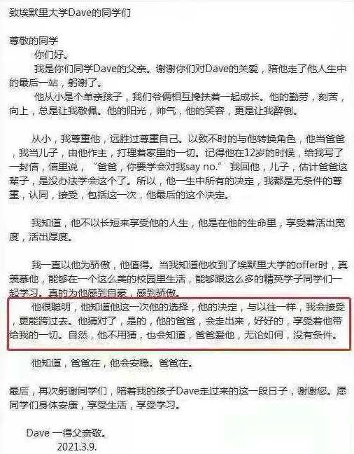 在该校牛津学院就读的大一中国留学生 Dave Zhang(张一得)3月5日突然去世。据悉,张一得秋季学期一直在苏州的家中上网课,春季返校上课,没想到出了意外。张一得去世后,父亲给他的同学写了一封信,名为《致埃默里大学Dave的同学们》,信中说:“一得一生中所有的决定,我都是无条件地尊重、认同、接受,包括这一次,他最后的这个决定。”“谢谢你们对Dave的关爱,陪他走了他人生中的最后一站。躬谢了。”由于没有透露张一得去世的原因,也没有后续报道,很多人纷纷留言询问,各种猜测也随之而来。有人说他得了肺炎,有人说他得了抑郁症,更多的人则将矛头指向了张一得的父亲——一个拥有百万粉丝的育儿网红、独自教育一得14年的单身爸爸。张一得的父亲“老得”曾是一名企业高管,在一得刚刚出生后不久,老得和妻子离了婚,一得则跟着老得生活。彼时的老得虽然不是育儿专家,但长期的管理经验,让他很快摸索出一套自己的理论:为了给足儿子陪伴,他先选择辞去高管职务,成为一名全职爸爸。然后老得带着一得从市区搬到了郊区,住房也从楼房换成了农家院。之后的家庭运转,全靠老得开垦、种菜、卖鸡卖鱼、捡破烂,以及好心人不时的帮助。小院子里有花草虫鸣,也有木制的小火车、小船、博物馆,还有滑滑梯,小院美丽得像个农庄。作为英语系毕业的高材生,一得的学前教育,老得亲力亲为。他把知识做成了一得的一日三餐,有大象造型的泰式菜,有仿造刚参观过的半坡遗址建筑的哈密瓜,甚至一个土豆,都要削成英文字母的形状。在一得成长的十多年里,一得爸爸累计创造了近万道菜,每天菜肴造型都不曾重样。同样,那些关于一得成长的难忘瞬间,比如换牙、打疫苗、拖地、打理花园……一得爸爸也用镜头拍摄了下来。十多年间,一得爸爸不同时期的数码相机里足足存下了二十万张照片。![]()