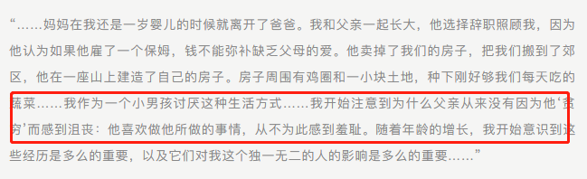 一得逐渐成为“支配者”,而“老得”却不折不扣地沦为“迎合者”。在老得的精神世界里,只有自由,没有平等,只有孩子,没有自己。但一得的自由是建立在成绩之上的,而维护“学霸”的地位是需要承受压力的。因此人们推测,老得为了贩卖他的育儿经,他唯一的筹码就是孩子本身,因此肯定会通过各种方式逼迫孩子优秀。或者,孩子感受到了父亲那种牺牲自我的爱,为了成就父亲,因此无法面对自己的失败。无以为报爸爸十几年牺牲自我的爱,我就把我的生命还给你……但通过看“一得他爹”的育儿公号,看媒体采访他父子俩的视频,很容易发现,这个定论证据不足。从一得他爹的育儿公号的内容来看,不过就是生活的零零碎碎,大致是想到什么就发什么。如果为了换取商业上的利益,他至少需要成体系的营销。而且,从他的公号的内容来看,的确如同网友所形容的“牺牲自我的爱”,但并没有任何信息可以看出,他在逼迫儿子优秀。更多的是一位用本能在教育孩子的父亲的形象,他对孩子极其用心,同时又喜欢显摆。所以,要在张一得的自杀,与他父亲的教育之间,建立起因果关系,未免有些牵强。而到底什么才是压倒张一得的最后一根稻草,这个问题恐怕也难以有答案。我慢慢地、慢慢地了解到,所谓父女母子一场,只不过意味着,你和他的缘分就是今生今世不断地在目送他的背影渐行渐远。你站立在小路的这一端,看着他逐渐消失在小路转弯的地方,而且,他用背影默默告诉你:不必追。