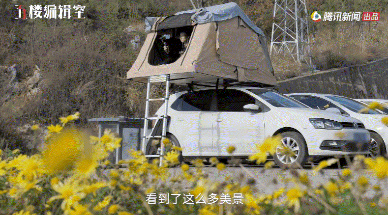 帐篷等自驾装备放在车顶,后备箱里放着锅碗瓢盆,油盐酱醋都很齐全,随走随停,这是她路上的家。