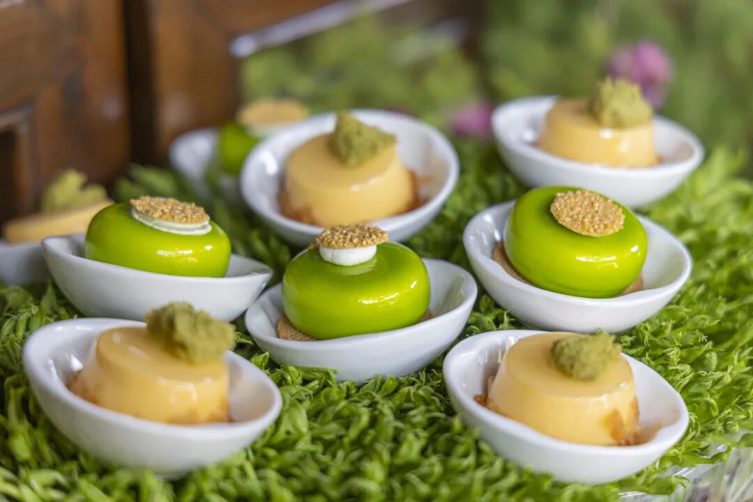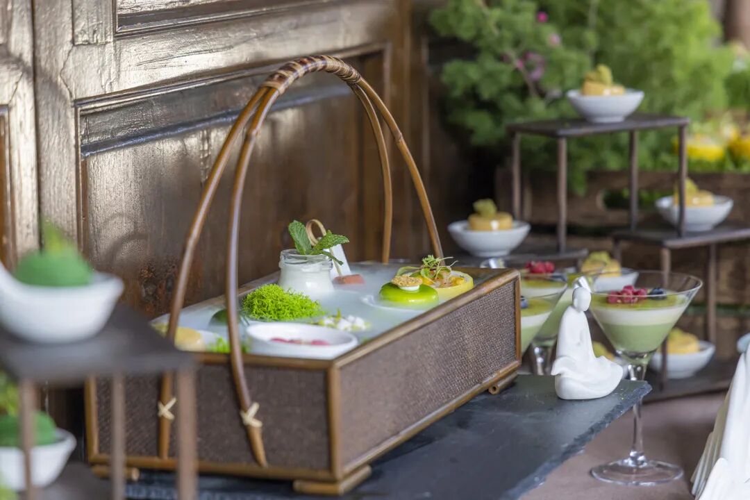 “不太甜是中国人对甜品最大的赞美。”这条“准则”对我来说也是适用的,所以我喜欢先吃咸点,给味蕾一个缓冲,更好地去接纳后面的甜。西式咸点鲜虾芒果沙拉杯和烟熏三文鱼棒棒糖莳萝酸奶油,吃起来毫无负担,满口清爽。中式点心里的鲍鱼雪菜清明团子应该是时令招牌,用来中和甜腻再适合不过。我当然舍不得一下子都吃完,尤其是当甜点的数量更多的时候,总习惯留一点在后面换换口味,在内心默默排好顺序。有时候还要纠结一番,想想怎么“排兵布阵”。甜点中的龙井芝士布丁杯配伴新鲜莓果、镜面酒酿配抹茶松软蛋糕以及抹茶冻杯三款均含有茶元素,其中的龙井是从法云茶园采摘,食材新鲜,口感甜度从左到右依次递进。奇异果香草慕斯配杏仁和青柠啫喱柠檬挞酸酸甜甜,不用配茶就可以吃完一整个。桃花玫瑰酥是这片翠绿中唯一的粉红色,靠颜值取胜,酥松清甜,要是外皮再薄一点就更好了。