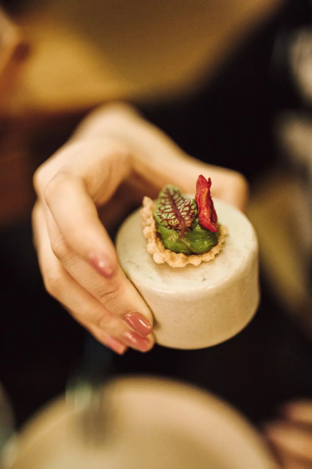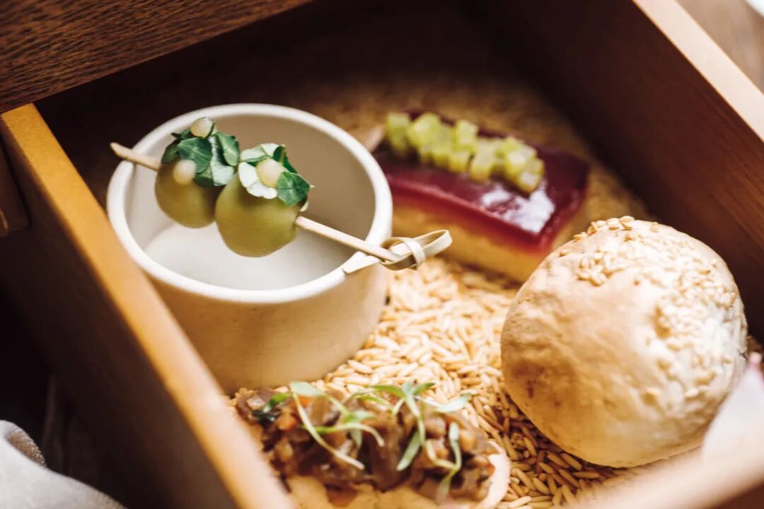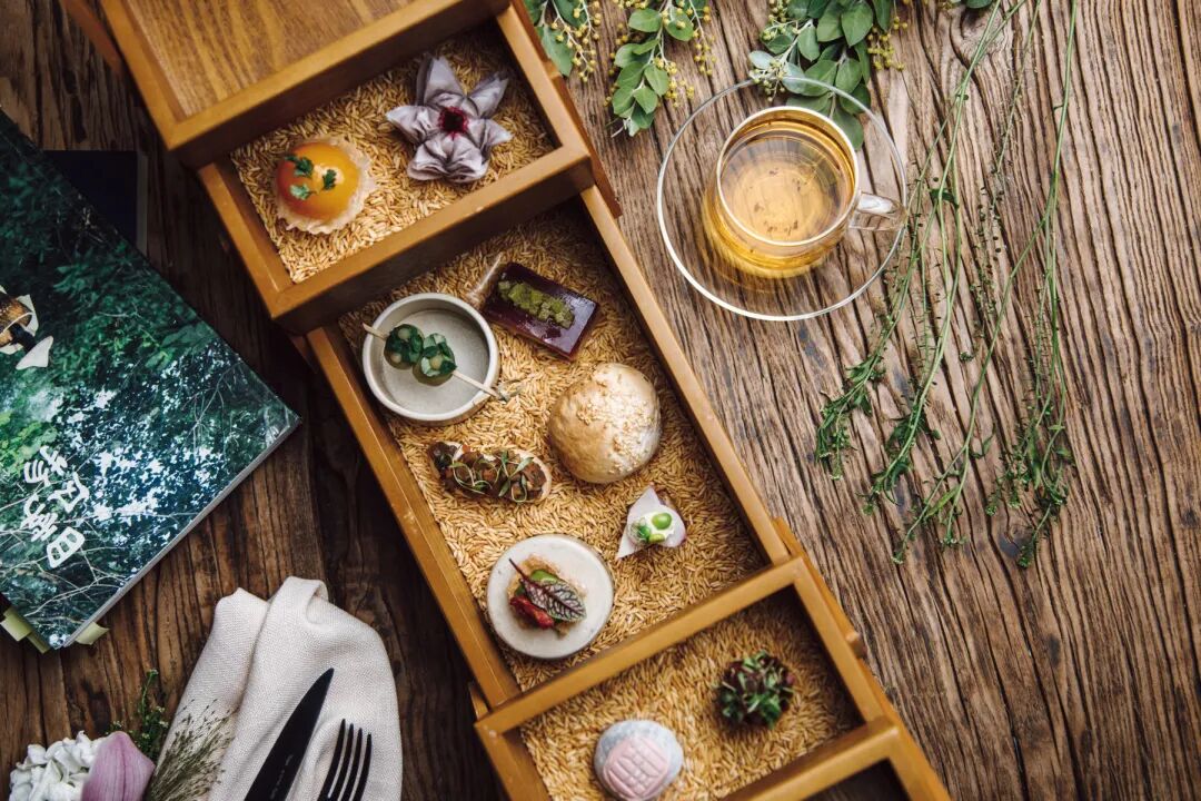 在此之前,我没有尝试过素食低糖的下午茶,结果比我想象中要出彩。五咸五甜共十件小点,装在一个中式的木质匣子里,模样精致小巧,可以品尝到银牙、山药、树莓、红枣、柑橘、萝卜、芋头、莲子的味道。个人认为最特别的要数“乐”,苹果、樱桃和朗姆酒的搭配,酸甜中带一丝苦涩,是一众“自律好学生”中的“顽劣之徒”。
