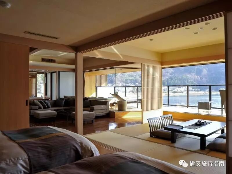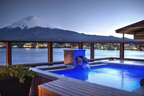 此酒店每间房间都可隔湖对话富士山,富士山宽厚的“肩膀”写满了伟岸,与之相对,仿佛被暖男拥入怀中。不少客舍在露台上配备了汤池(还有景观绝杀的公共汤池),让人以最惬意的姿态对话圣山。