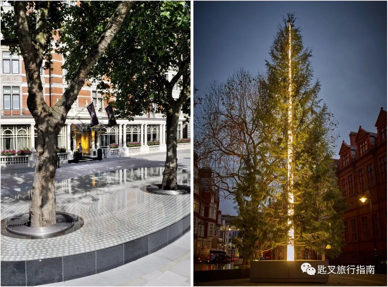 ▲ 二姐Connaught门前的水池是安藤忠雄的艺术创作“静默”,该作品每15分钟造雾15秒。2016年,酒店还用Antony Gormley爵士加持的圣诞树与水池作伴