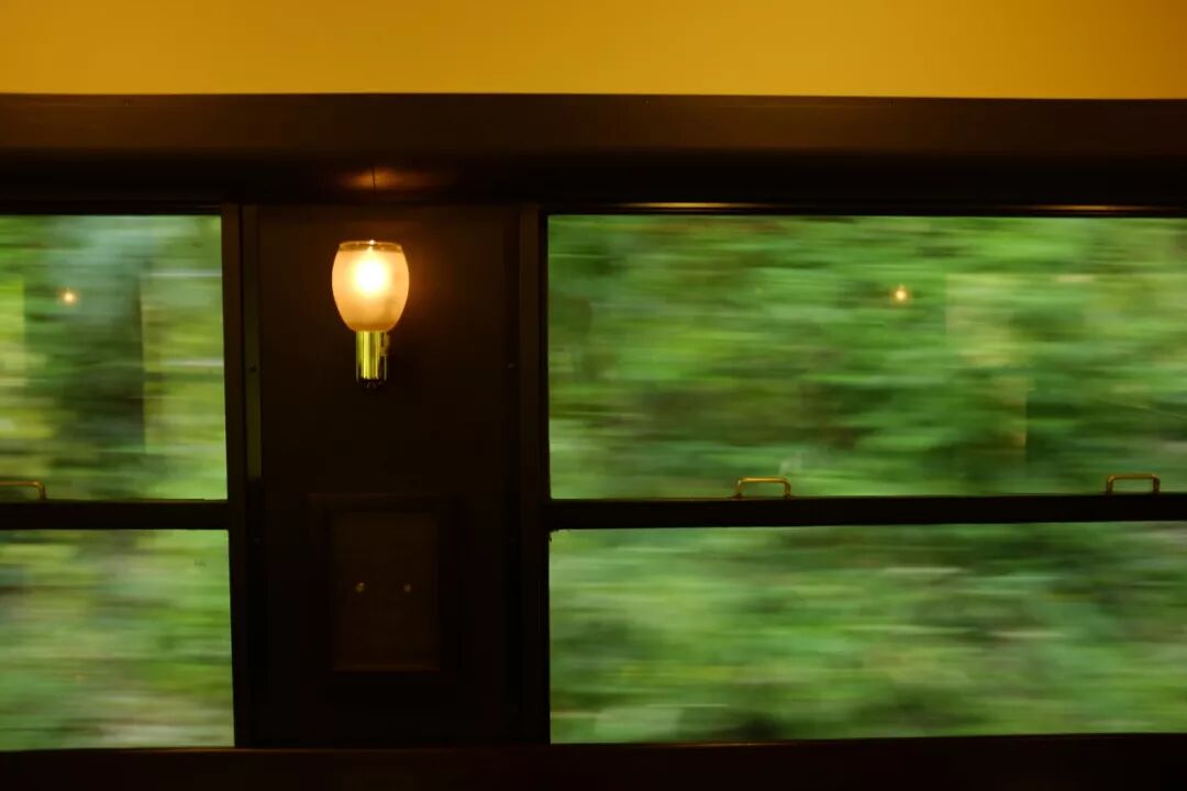 整个车厢在木纹打底的基础上,顶部做了绿色花纹的墙纸,使用元素是人吉代表的,桧木与杉木,玻璃隔断上都是翡翠鸟的图案,并用流苏屏风来分割开座位的区域,仿佛置身于自带滤镜的山麓森林里。