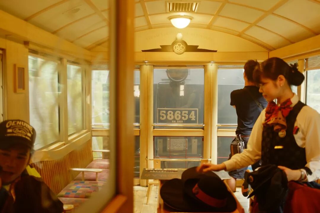 伊三郎沿途会停靠一些小小的但有特色的站点,比如SL人吉最古老的列车的纪念地,乘务员会告诉大家哪些地方可以拍照,并举着小牌子下车邀请乘客们去拍。我请乘务员与列车司机一同拍了照,他们笑的很美,就跟这辆车一样。