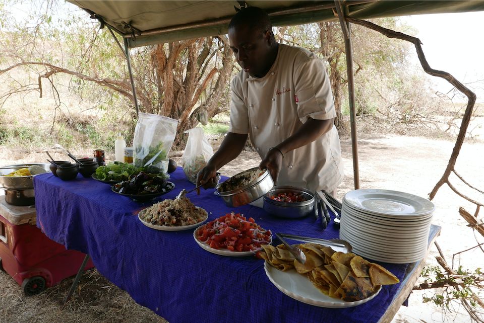 好吧,其实我们都被演技深藏不露的好运先生骗了!这是营地为客人准备的惊喜午餐,几乎全员出动,带来了新鲜的沙拉和冷菜,大厨现场抄着黄油大蒜鸡肉,香气四溢;临时酒吧虽然看着不fancy,但品类也是非常齐全了,要知道从营地到这里至少也要一小时车程。Whatever,先来杯Pimm's才是正经事!